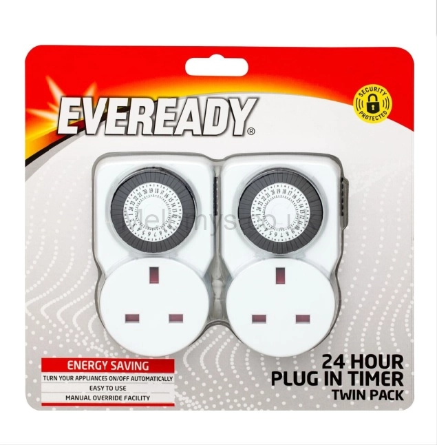 FREE & FAST DELIVERY - Eveready 24hr Plug-In Timer Sockets. Make sure your house looks occupied while you're on holiday with these Plug-In Timer Sockets. Plug a lamp into the socket, set the time you'd like it to switch on every 24 hours and enjoy your holiday.